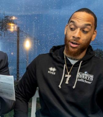D’Angelo Harrison sbircia le sue statistiche. La salvezza del Roseto passa giocoforza attraverso i mastodontici bottini del numero 7, che a Roseto gioca col numero 9 per rispetto alla canotta ritirata di Remo Maggetti. [Mimmo Cusano]