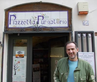Il posto in cui presenteremo Samarcanda si chiama “Piazzetta Purgatorio”, è un circolo e mi era simpatico fin da Roseto, perché il nome mi comunica accoglienza e indulgenza per noi peccatori. E chi è senza peccato è un cialtrone bugiardo.