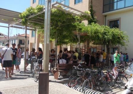 Roseto degli Abruzzi, lunedì 7 luglio 2014. Lavoratori della Rolli attendono, sotto il Municipio di Roseto, gli esiti della prima riunione del tavolo di concertazione.