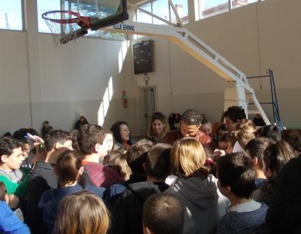 È li, in quel preciso momento, che la palestra si “scioglie”: i ragazzini e le ragazzine “impazziscono”, diventano sé stessi: tutti tirano, fanno centro, vanno fuori, corrono, gridano, saltano: i colori si stingono, la pelle si confonde, i visi s’illuminano di sorriso, gli abbracci fanno tutt’uno tra la palla ed i corpi: Rauf, l’uomo di colore, di religione islamica, la star dello sport internazionale, è lì: uno di loro: corre, si fa fotografare, ride e dice, splendidamente tradotto in simultanea da alcune alunne poco più che bambine: “l’importante è passare la palla; non si fa canestro da soli; non si è felici da soli; non si è felici se gli altri sono tristi”.