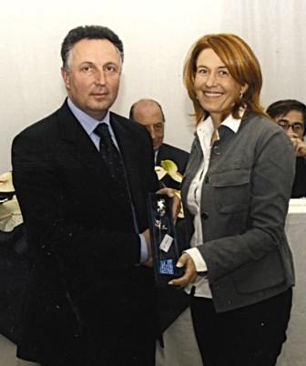 2005. Franco Di Bonaventura premia Monica Maggioni, attuale Presidentessa della Rai, nell’ambito del premio letterario Città delle Rose.