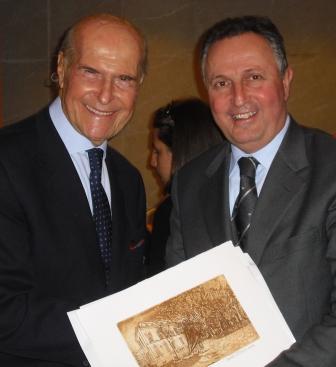 2010. Franco Di Bonaventura incontra Umberto Veronesi a L’Aquila e gli consegna un ricordo di Roseto degli Abruzzi.