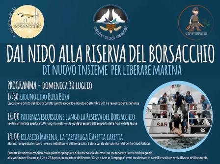 La Riserva Naturale del Borsacchio torna a far parlare di sé. Domenica 30 luglio, infatti, si terrà la manifestazione “Dal nido alla Riserva del Borsacchio - Di nuovo insieme per liberare Marina”: escursione e rilascio di una tartaruga.