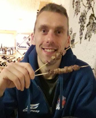 Simone Pierich ‘si rosetanizza’ con gli arrosticini. [Fabio Talamonti]
