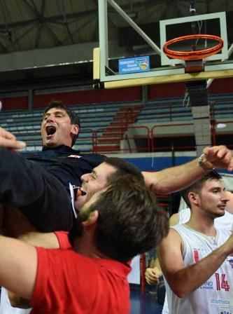 VINCENTE! Stefano Rajola, che ha centrato la promozione al suo secondo campionato da coach. [Foto Amatori Pescara / Federica Roselli]