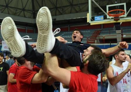 Stefano Rajola, coach dell’Amatori Pescara, portato in trionfo a Montecatini, dopo aver conquistato la promozione in A2. [Amatori Pescara / Federica Roselli]