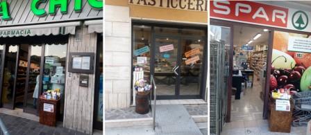 I cesti solidali attivati nei giorni precedenti alla Farmacia Chicco, al Panificio Il Re dei Fratelli Collevecchio e al Supermercato Despar.