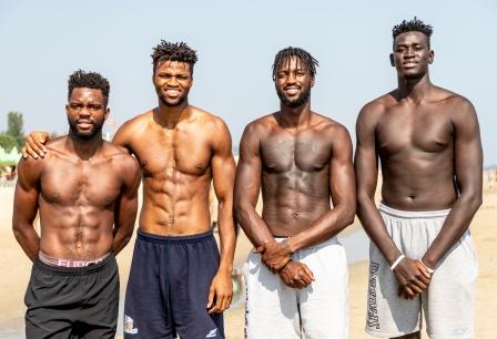 Aristide Mouaha, Jordan Bayehe, Khadeem Lattin, Dut Mabor, in una pausa del precampionato di A2 2019/2020 con il Roseto Sharks. [Cusano Photo]