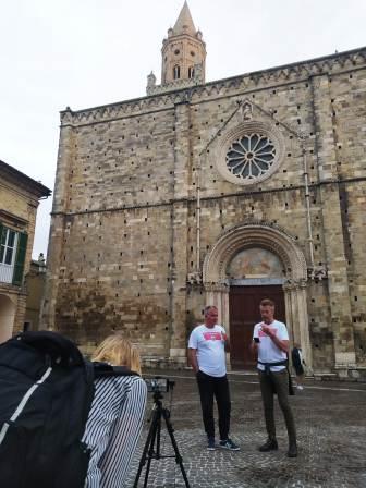 Luca Maggitti e Giorgio Pomponi durante la puntata, davanti alla Basilica di Santa Maria Assunta, cattedrale di Atri. [Candeloro Rasetti]