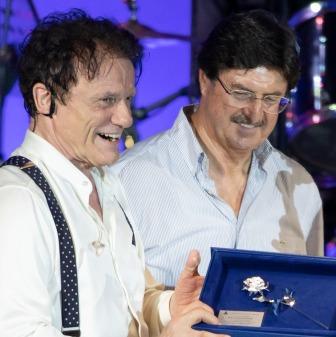 Roseto degli Abruzzi, 2019. Massimo Ranieri consegna la Rosa d’Argento donata dal Comune di Roseto a Silvio Brocco, al suo fianco. Silvio, padre di Fabio, è patron del Pineto Calcio, sodalizio di Serie D. [Marco Cimorosi]
