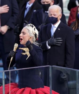 Stati Uniti d’America, Washington, 2021. Lady Gaga canta l’Inno degli Stati Uniti d’America nel giorno del giuramento del Presidente Joe Biden, alle sue spalle nella foto.