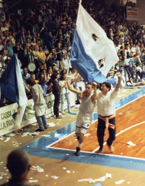 Roseto, palasport, stagione 1995/1996. Marco Verrigni vince la Serie C1, con il Roseto Basket Lido delle Rose di coach Di Bonaventura, battendo il Lugo, e fa il giro del campo abbracciato dal tifoso Ernesto Francani. [Mario Rosini]
