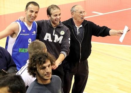 San Nicolò a Tordino, palasport, stagione 2009/2010. Marco Verrigni vince la Serie C2, con il Roseto Sharks di coach Antimo Di Biase, battendo il Penta Teramo, e fa il giro del campo abbracciato dal tifoso Davide Di Sante e dal dirigente della squadra, il compianto Vittorio Fossataro. [Cusano Photo]