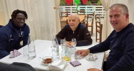 Magaye Seck, Domenico Sorgentone e Luca Maggitti a cena dopo la trasmissione TIMEOUT 2.0, qualche mese fa, all’Hercules di Roseto degli Abruzzi.
