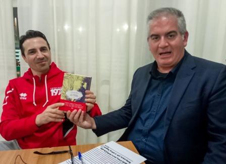 Luca Maggitti dona il libro ‘Il figlio del padre’ di Víctor del Árbol al coach del Chieti, Daniele Aniello. [Mimmo Cusano]