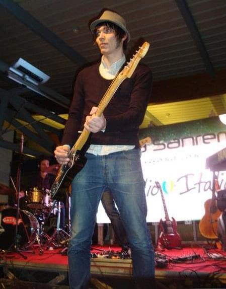 Mattia Pompei, chitarrista del gruppo ‘La Differenza’, durante una sua esibizione a margine del Festival di Sanremo, nel 2005.
