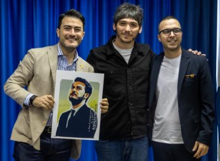 Antonino Monteleone con in mano un suo ritratto disegnato da Mattia Pompei (artista al centro nella foto), che gli è stato regalato dall’organizzatore della manifestazione Francesco Iannetti (a destra nella foto). [Mimmo Cusano]