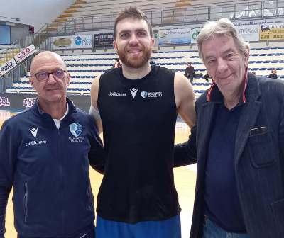 Andrea Petracca, fra coach Franco Gramenzi e il presidente Ernesto Ciafardoni, lo scorso 27 gennaio 2024, giorno del suo ingaggio da parte della Pallacanestro Roseto. [Luca Maggitti Di Tecco]