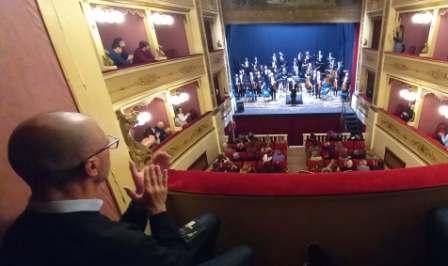 Franco ‘von Karajan’ Gramenzi applaude la sua orchestra, dopo l’eccezionale prova di questa sera. [Luca Maggitti Di Tecco]