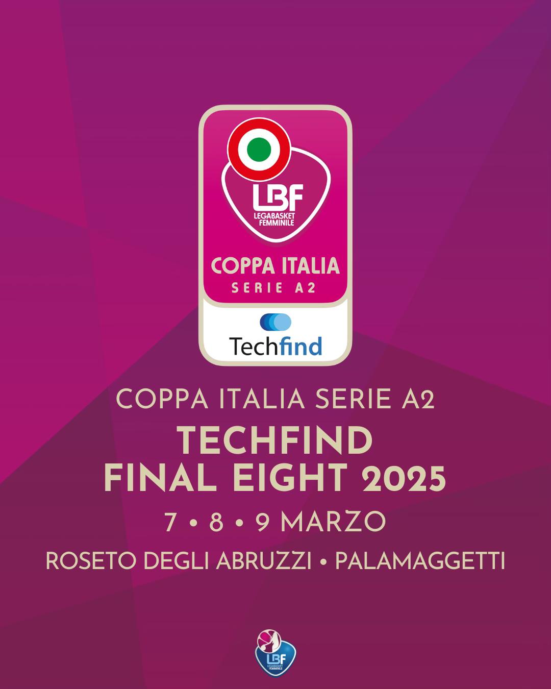 Come ampiamente anticipato, da almeno due settimane, da Roseto.com, oggi la Lega Basket Femminile ha annunciato che Techfind sarà il Title Sponsor della Final Eight 2025 di Coppa Italia Serie A2, che si svolgerà per il secondo anno consecutivo al PalaMaggetti di Roseto degli Abruzzi il 7, 8 e 9 marzo 2025.