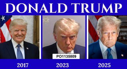 Da sinistra: Donald Trump nella sua foto ufficiale di Presidente degli Stati Uniti d’America del 2017; nella foto dell’arresto (per pochi minuti, uscito su cauzione) del 2023; nella sua foto ufficiale di Presidente degli Stati Uniti d’America del 2025. [Luca Maggitti Di Tecco]