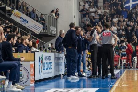 Il momento della sospensione della partita, fra Roseto e Pesaro, con il colloquio fra la terna arbitrale e i due coach. [Mimmo Cusano]