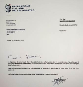 Il fondatore della Scuola Minibasket Roseto ha ricevuto la comunicazione dalla FIP. Complimenti a congratulazioni!