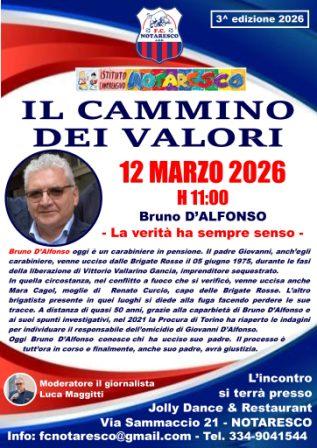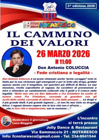 Dopo il successo delle precedenti edizioni premiate nel 2024 dal Settore Giovanile e Scolastico della FIGC quale “Miglior progetto di sviluppo calcio nella scuola in Italia” e il prestigioso riconoscimento del 2025 da parte della Prefettura di Teramo “Per l’impegno profuso nella promozione dei valori della legalità a favore delle nuove generazioni”, torna a Notaresco l’appuntamento con l’iniziativa “Il Cammino dei Valori”, ciclo di incontri socio-educativi e culturali organizzati dalla F.C. Notaresco, locale Scuola Calcio, con la collaborazione dell’Istituto Comprensivo di Notaresco.