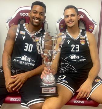 Pierpaolo Marini vincitore della Supercoppa di Serie A2 2023/2024 con Trapani, insieme a Yancarlos Rodriguez. [LNP/Ciamillo & Castoria]