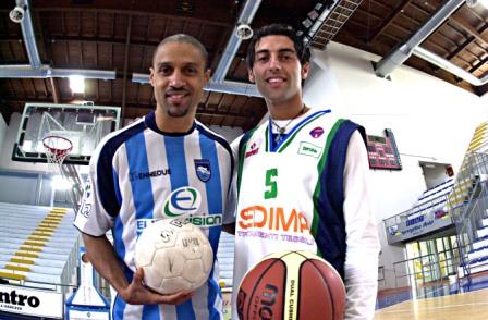 PalaMaggetti, 2005. Mahmoud Abdul-Rauf, all’epoca giocatore del Roseto Basket, e Daniele Croce, all’epoca giocatore del Pescara Calcio. [Luciano Adriani]
