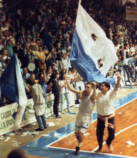 Roseto, palasport, Campionato di Serie C1 1995/1996. Il Roseto Basket del presidente Giovanni Giunco e di coach Gabri Di Bonaventura ha appena vinto Gara 3 contro Lugo, ottenendo la promozione in Serie B2. Marco Verrigni, cannoniere e trascinatore del Roseto, fa il giro d’onore con la bandiera. Al suo fianco, il tifoso Ernesto Francani, oggi coach del Roseto Basket.